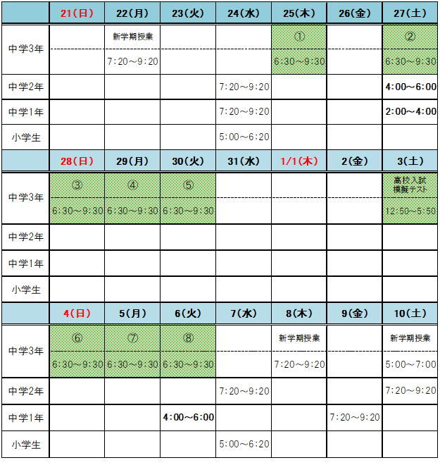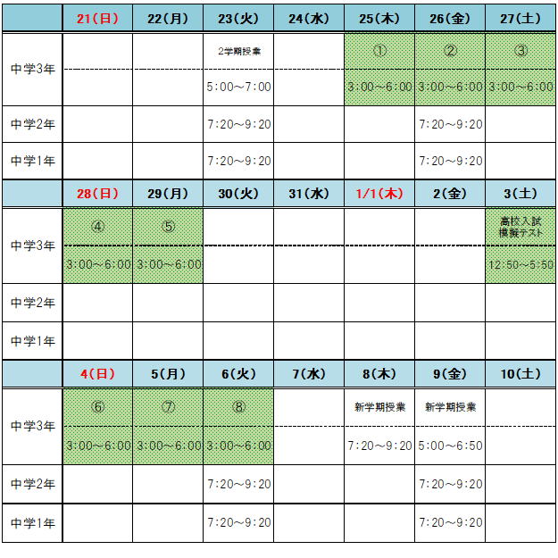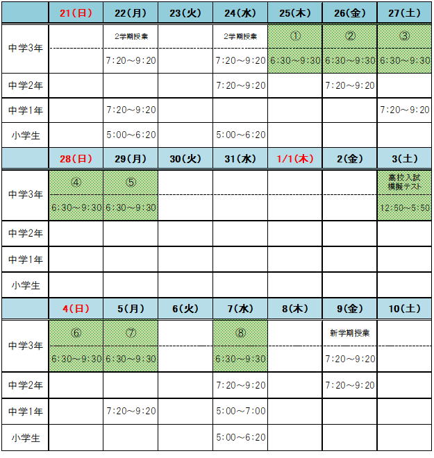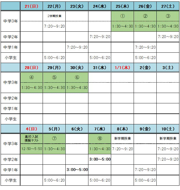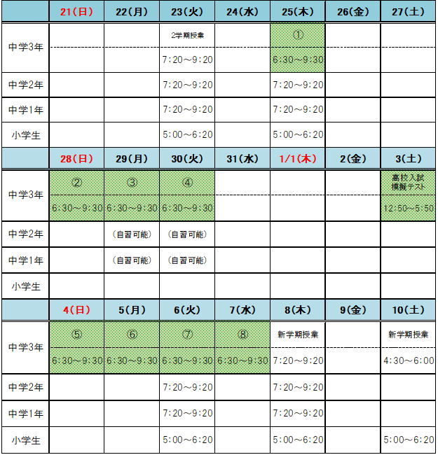 小学生、中学1年生、中学2年生の対象の冬期講習は行いません
